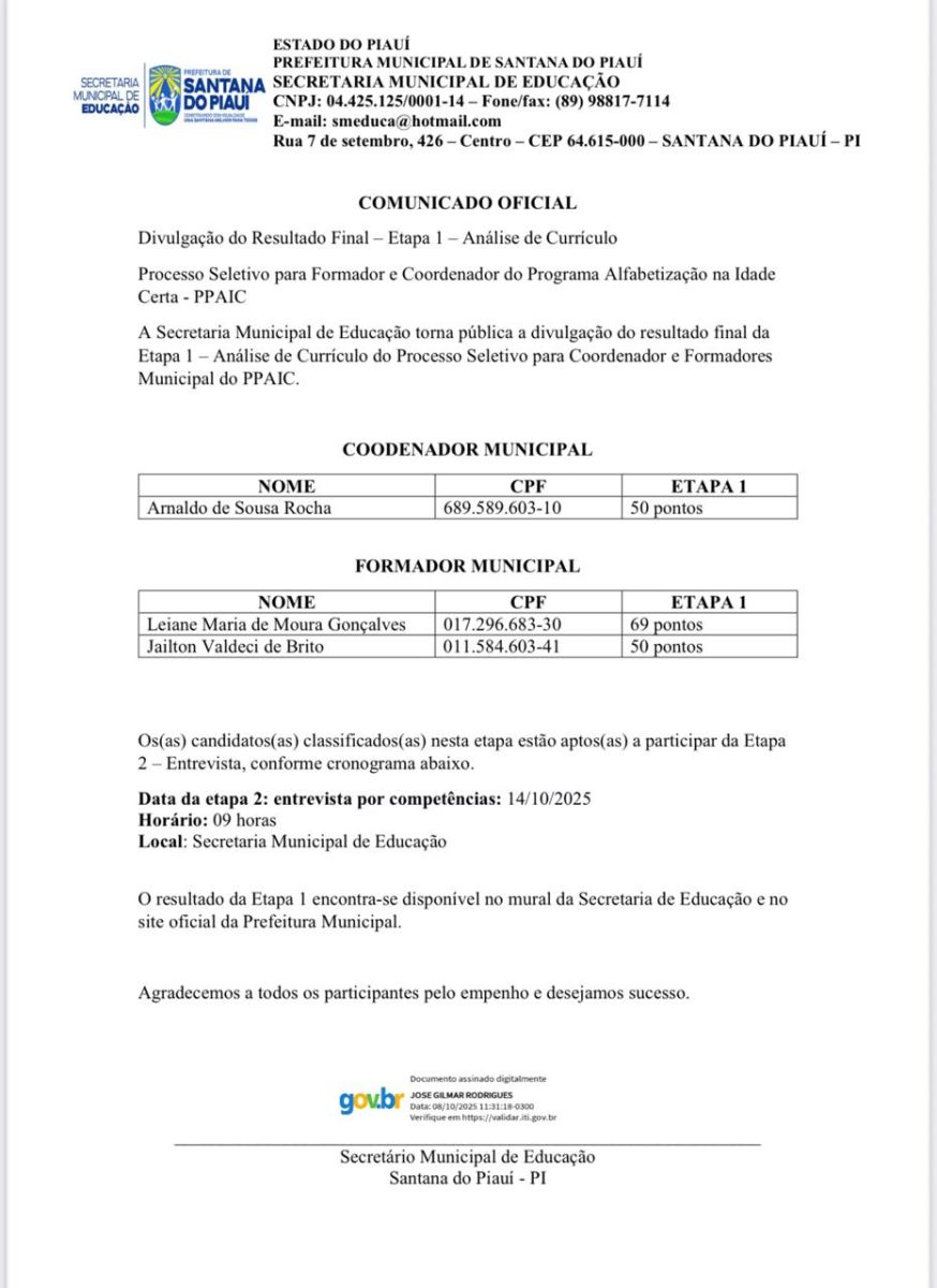 A Prefeitura de Santana do Piauí através da Secretaria Municipal de Educação divulgou resultado do processo seletivo para formador e coordenador do Programa Alfabetização na Idade Certa. Confira o resultado!