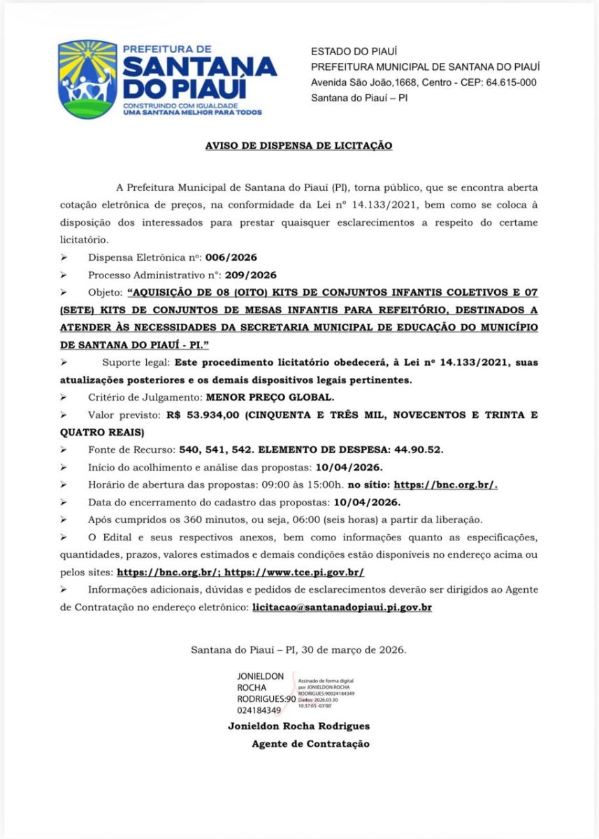 Aviso de Dispensa de Licitação - Nº 006/2026